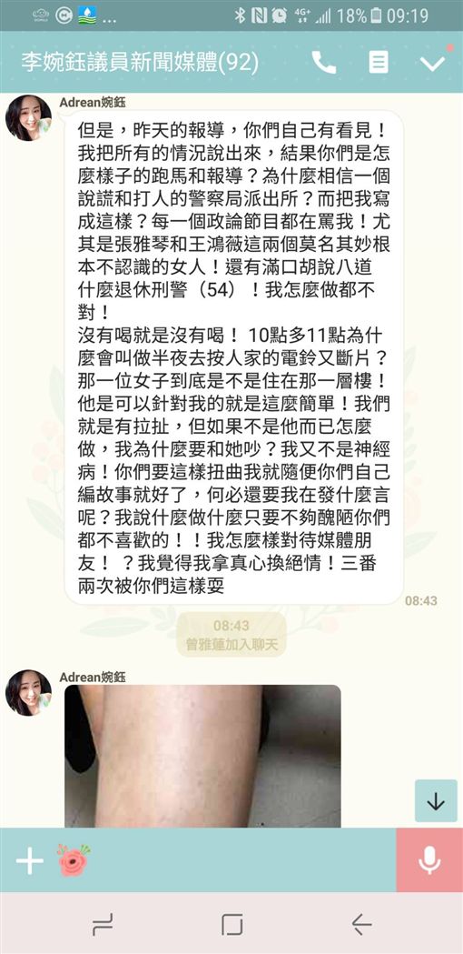 對此,李婉鈺今在媒體群組抓狂幹譙新聞報導:「為什麼相信一個說謊和打人的警察局派出所?而把我寫成這樣?」她甚至點名主播張雅琴、議員王鴻薇2人:「每一個政論節目都在罵我!這兩個莫名其妙根本不認識的女人!」最後甚至反諷媒體:「你們要這樣扭曲我就隨便你們自己編故事就好了,何必還要我在發什麼言呢?我說什麼做什麼只要不夠醜陋你們都不喜歡的!!我怎麼樣對待媒體朋友! ?我覺得我拿真心換絕情!三番兩次被你們這樣耍」。李也強調:「沒有喝就是沒有喝! 10點多11點為什麼會叫做半夜去按人家的電鈴又斷片?那一位女子到底是不是住在那一層樓!他是可以針對我的就是這麼簡單!」