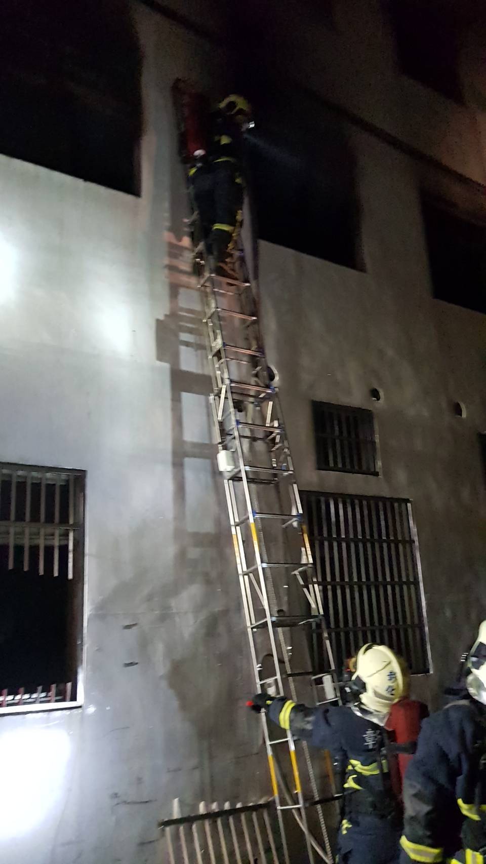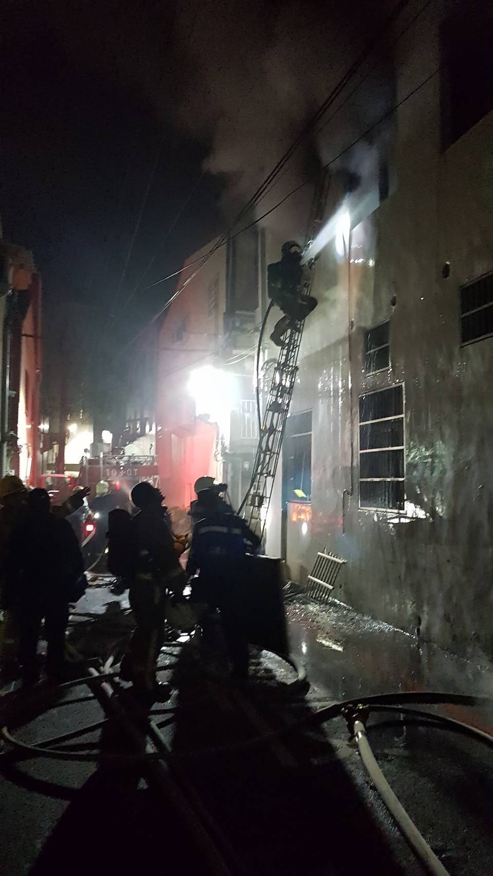 彰化縣消防局凌晨接獲報案後,立即派遣了15車40人前往現場,架梯破門將位於頂樓的45歲江姓兒子與其妻兒救出,3人雖有嗆傷但送醫後已無大礙,江姓兒子被救出後急喊「爸爸還沒出來!」但消防人員抵達77歲江姓老父房間時,發現他與67歲妻子已倒臥在地失去生命跡象,研判兩人是吸入過多濃煙,昏倒在地後被大火燒成焦屍。