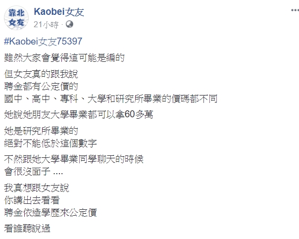 一名網友在臉書《Kaobei女友》上PO文表示,雖然他自己也感到不可思議,但女友確實篤定地告訴他,聘金依照不同學歷有不同的公定價,國中、高中、專科、大學和研究所畢業的價碼都不同,還向他表示「朋友大學畢業都可以拿60多萬」,自己是研究所畢業,絕對不能低於這個數字。