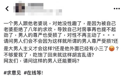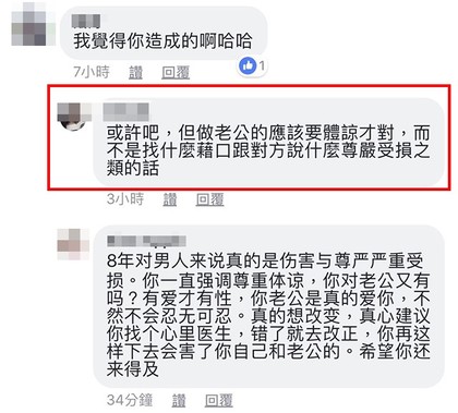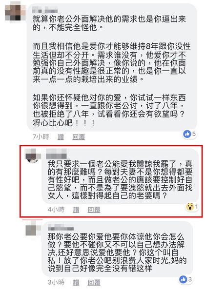 另外也有網友表示:「如果你懷疑她對妳的愛,妳試試一樣東西妳很想得到,一直跟妳老公討,討了8年,也被拒絕8年,妳還會有慾望嗎?將心比心吧」、「就算你老公在外面解決他的需求,也是你逼出來的」、「不想要時就打槍先生8年,想要時被打槍就上網公審先生,完全是標準的公主病」、「娶個充氣娃娃都比娶妳好」、「惡人先告狀,妳這樣的女人才不能要!」「他只是以其人之道還治其人之身,我不覺得他有什麼錯」。