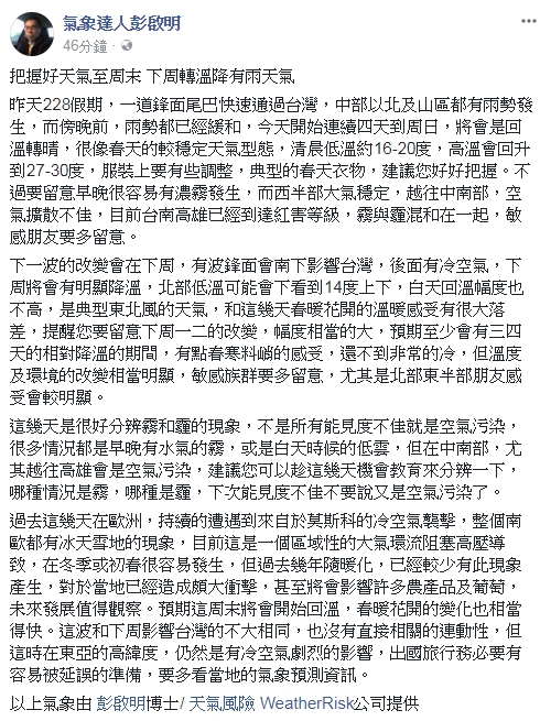 另外,關於「怪霧」的部分,氣象局解釋,這是因為氣溫回升後,空氣中的水氣飽和後,和地熱形成「輻射熱」。而氣象達人彭啟明也在臉書表示,今天開始連續四天,都會是很像春天的天氣,白天高溫會回升到27到30度,但要留意早晚很容易有濃霧的出現,越往中南部空氣擴散越不好,有霧和霾混和的情況。此外,彭啟明也提醒,四天好天氣之後,會有一波冷空氣南下,下周起氣溫會明顯下降,低溫恐怕下探14度,會和這幾天的感受上有明顯的落差。