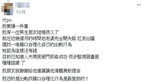 紅杏出牆,還為自己出軌的行為找了一堆藉口,並覺得自己行為根本沒有錯,女網友表示,她朋友已經兩度破門,將老婆和小王在床上翻雲覆雨的樣子逮個正著,女網友也付上幾張照片做佐證,並謝謝女網友給他建議「讓他清醒勇敢提告」,而女網友則是幫男朋友覺得委屈「我怨的是出軌找藉口合理化行為是最差勁的!」