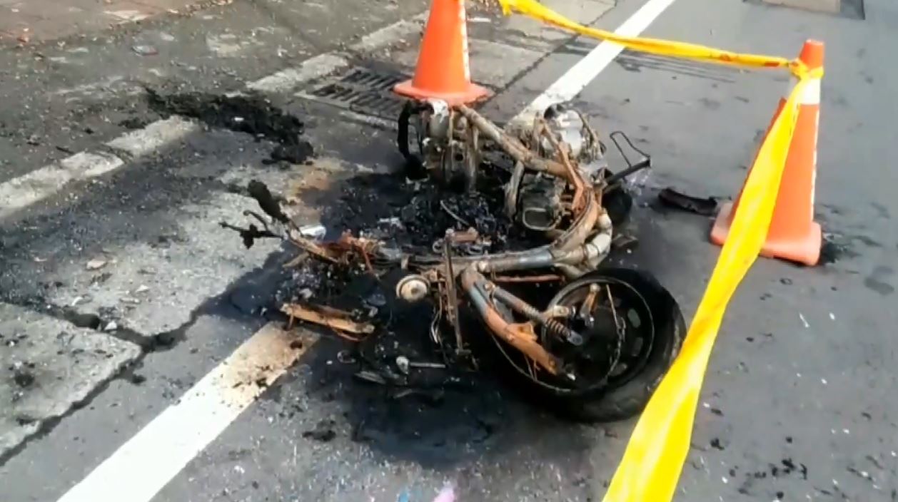 白天重回現場,機車燒到只剩骨架,成了一堆黑黑的廢鐵,而機車怎麼會起火呢?蔡姓騎士跟警察說,從台中騎車到彰化,由於天雨路滑,因此一不小心就摔車。