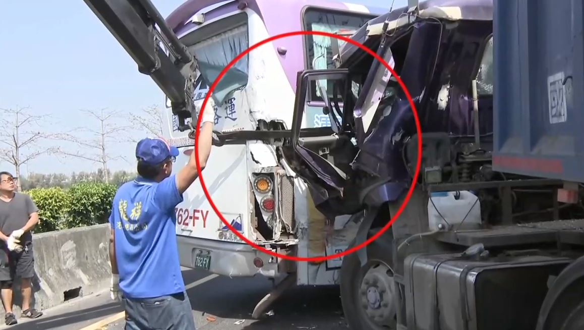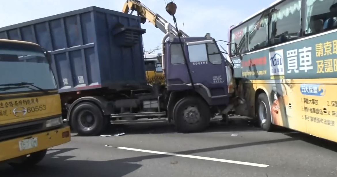 ▼閃事故釀追撞!砂石車撞國光客運 14乘客驚魂▼