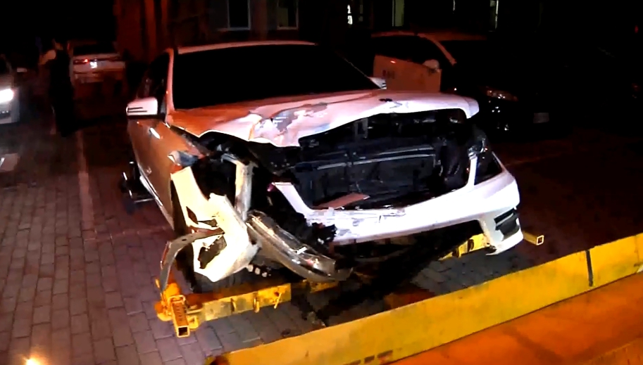 ▼白色賓士車頭全毀,可見撞擊力道相當猛烈。(圖/東森新聞)
