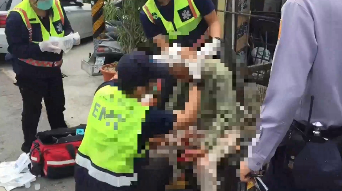 碰的一聲猛烈撞擊,休旅車保險桿掉落,車頭嚴重毀損,車内血跡斑斑,玻璃也碎成蜘蛛網狀,開車的是一名75歲的洪姓阿伯,額頭嚴重撕裂傷,當場血流如注。