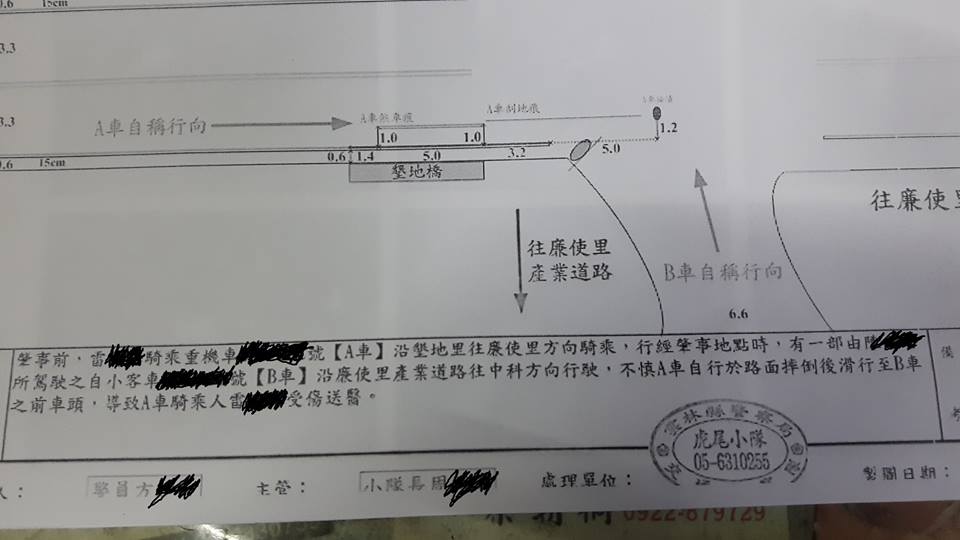 事情發生在去年6月12日晚上近8點,一名駕駛開車行經雲林虎尾一處產業道路路口時,左側道路有一名機車騎士行駛而來,卻突然自己摔車,接著就一直滑行撞到汽車,騎士受傷送醫。