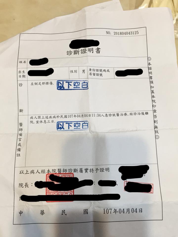 獅子大開口?一名男子4日到早餐店用餐時,腳踝不慎被椅子劃傷流血,當下表示不須員工陪同就醫,但3天後卻拿著驗傷單向店家