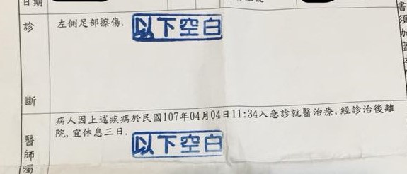 男子7日拿著一張驗傷單找早餐店求償,上頭清楚註記擦傷,「宜休息3日」,男子聲稱自己在美式大賣場工作,依月薪6萬換算下來,休息3天就損失了6千塊,加上先前看診的1千元,店家總共要賠償他7千元,店家無奈地說「如果未達他的要求,他說下次就不是這麼簡單處理了…」。