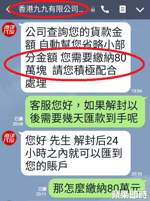 ▼詐騙集團一人分飾兩角,假裝是「香港九九有限公司」與陳男對話(圖/翻攝畫面)