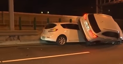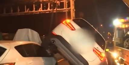 台中市豐原警分局交通分隊,深夜在台74線快速道路,處理一名羅姓男子酒駕自撞護欄車禍,正當警方現場進行交通管制時,後方卻開來一輛白色進口車追撞警車,破壞力超狂,駕駛隨後又將一輛轎車整個推撞到內側車道,一陣翻滾後側翻壓在對方車上,變成兩輛車子疊羅漢,場景超誇張。