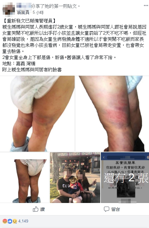 根據《蘋果日報》報導,女童原本和媽媽及阿嬤住一起,今年農曆年後,女童被媽媽帶去和同居人同住,結果前天有人發現女童身上傷痕遍布,這才通報社會局。雖然目前女童母親和其同居人都未到案,但同居人母親表示,因為小朋友不聽話,才會被罰站2天、用藤條打腿,目前該案已轉婦幼隊及竹崎分局調查。
