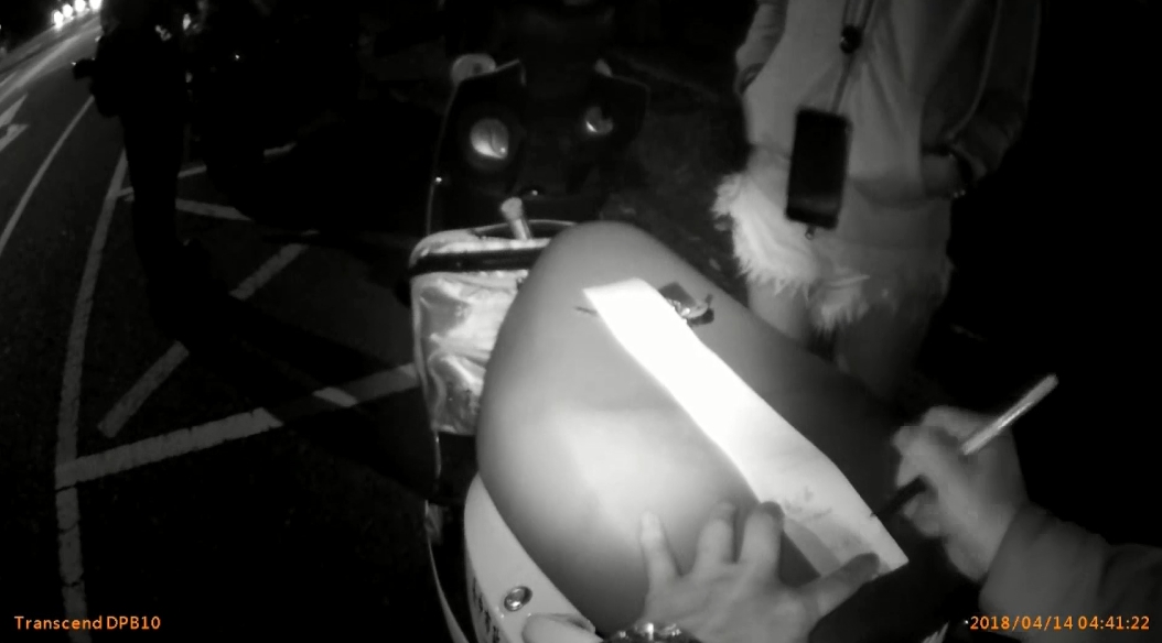 凌晨4點多女子騎車回家被警方攔下,全身都是酒氣,還一臉笑咪咪,沒發現員警就騎在旁邊,女子事後坦承,當天和朋友到夜店狂歡,喝了幾杯調酒,回家途中怕發生危險,一時興起才會沿路狂按喇叭,沒想到反而引起巡邏員警注意。