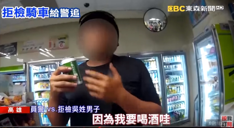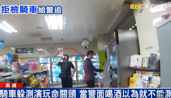 高雄市一名吳姓男子疑似酒駕,不但拒絕攔查,還騎機車跑給員警追,最後吳男眼見甩不掉員警,乾脆停車衝進超商,立刻拿起啤酒喝下肚,喝得太快還頻頻打嗝,他以為這樣就能躲過酒測,不過這算盤打錯了,因為15分鐘後還是得測,現在他除了公共危險罪外,還多了好幾張罰單。