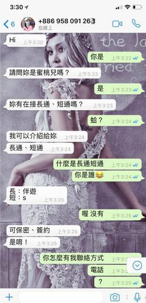 高雄范冰冰」的蜜桃兒近日在個人臉書PO出對話截圖,只見色情仲介問她「有在接長通、短通嗎?」她當下覺得有點莫名奇妙地回了一個「蛤」字,接著向對方詢問「什麼是長通短通?你是誰?」,對方隨後則回覆:「長:伴遊,短:S(性交易)!」,她得知後馬上拒絕,沒想到對方仍堅決強調:「可保密、簽約。」,並問對方為何有她的聯絡方式與電話。