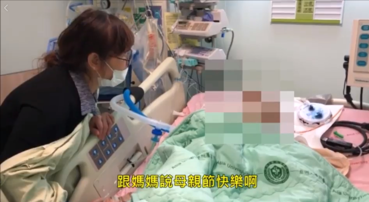 ▼媽媽站在病床前不斷喊話。(圖/擷取自亞洲大學附屬醫院 臉書)