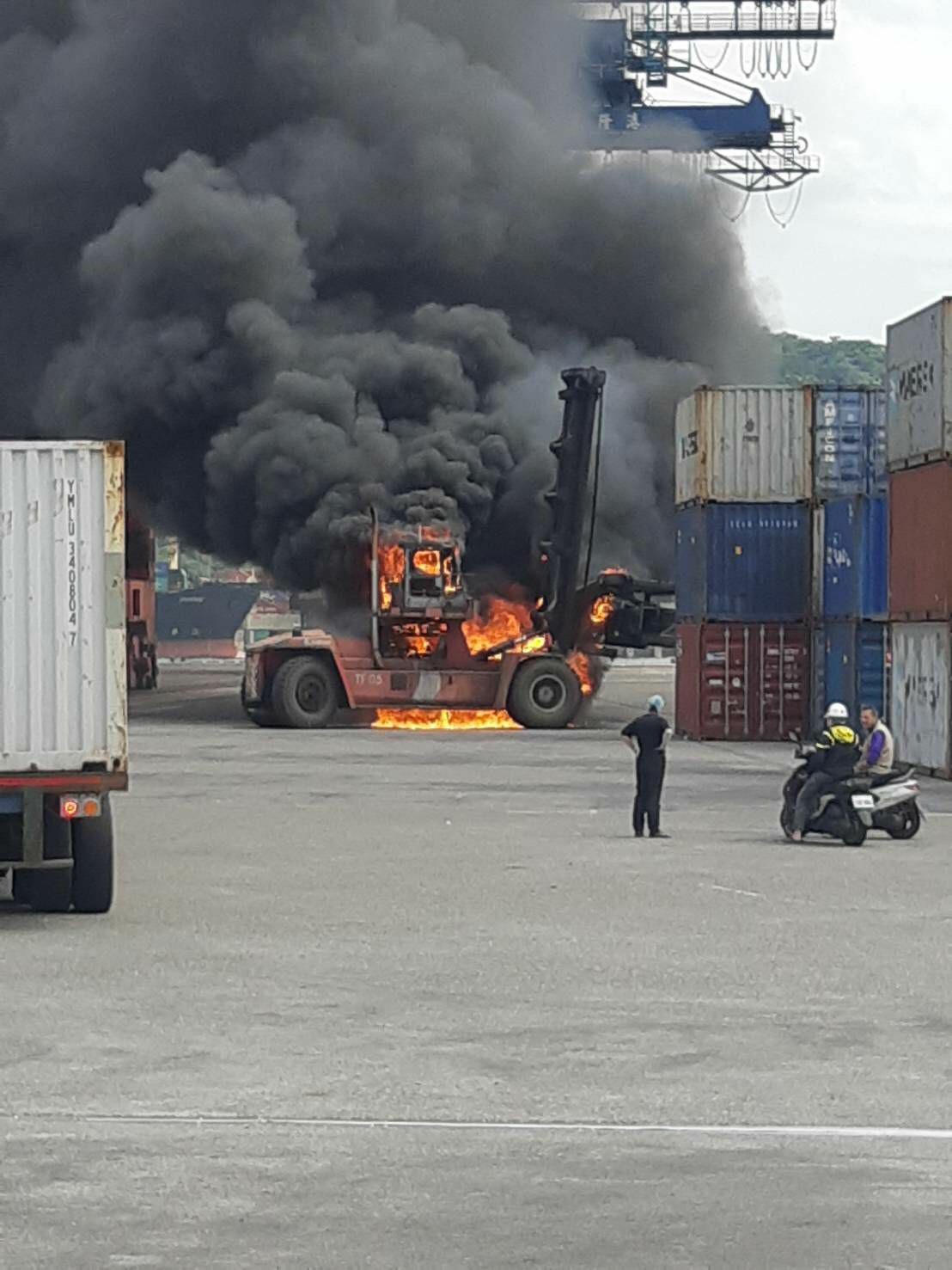 快訊/基隆港西19號碼頭傳爆炸聲?貨櫃堆高機大火