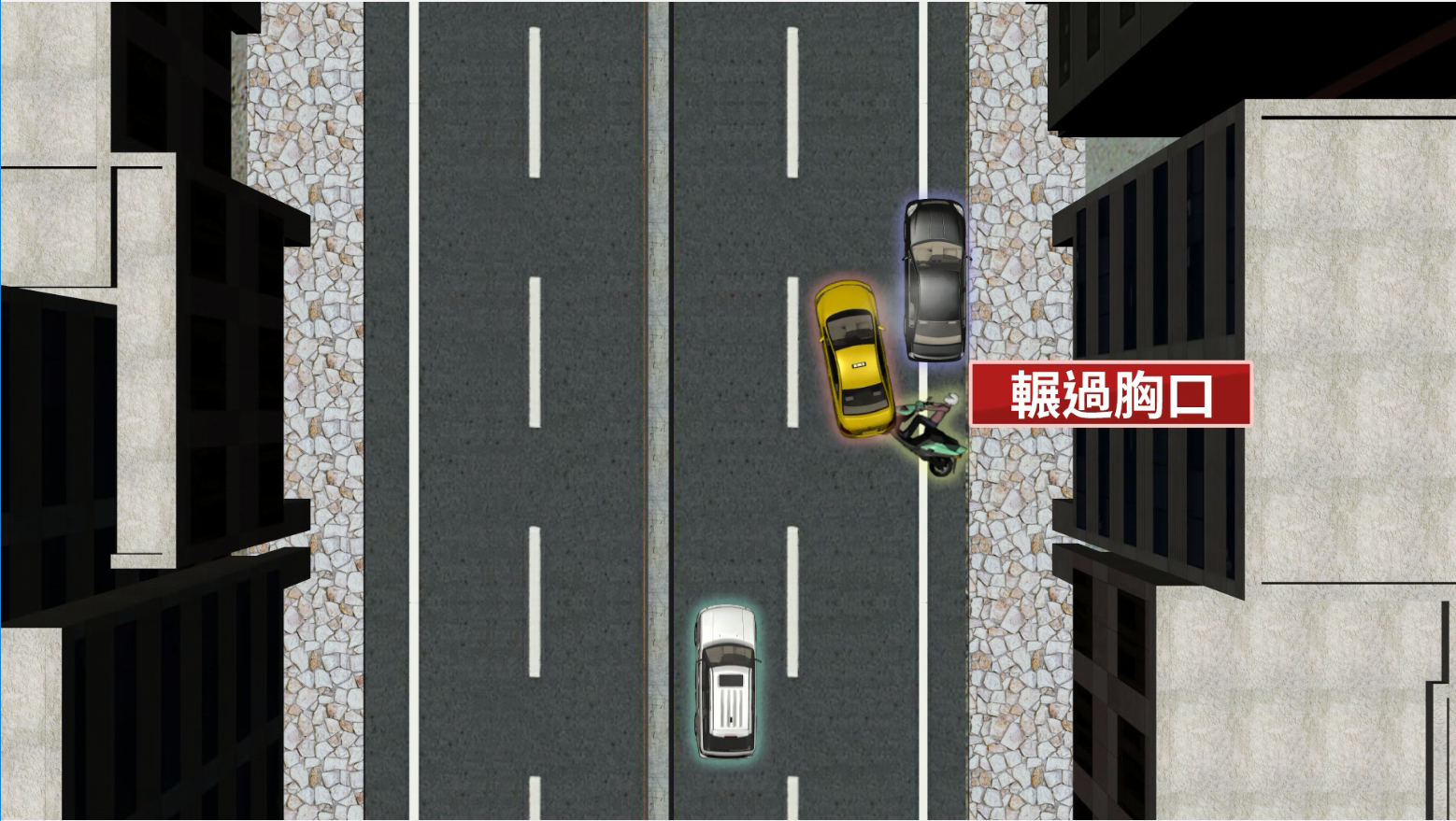 女騎士從後面被衝撞往前摔出,計程車這時竟將她輾過,女騎士送醫發現肋骨斷裂,女騎士急送急診搶救。