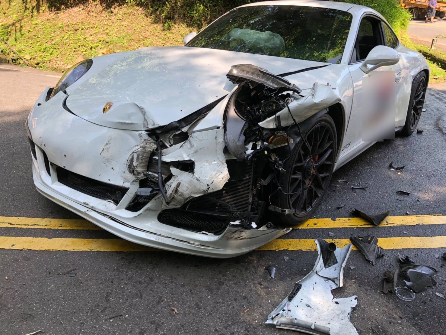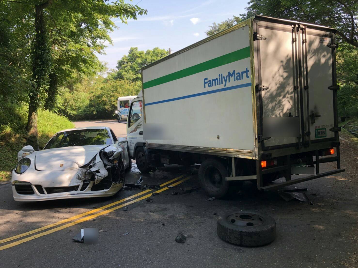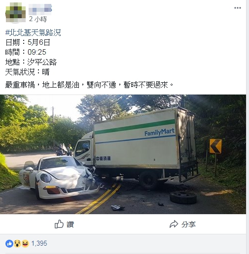 一名網友在「重機車友▕ 各區路況、天氣回報中心」臉書社團上PO文提醒大家汐平公路發生事故,從照片中可以看到一輛超商的貨車和白色保時捷,在彎道的地方,發生了擦撞,貨車頭以45度角的方式,橫在路中間,還越過雙黃線。而保時捷則是左前方車頭全毀,零件四散,連車牌都撞掉,可以感覺到撞擊力道相當猛烈。