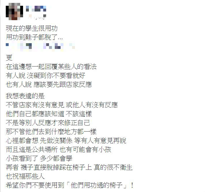 在相同環境待久難免會覺得疲乏,有不少人會選擇到咖啡店或速食店聊天小聚,但日前一名網友在臉書社團發文,稱在星巴克目擊3名學生在念書,卻發現3人不但脫鞋子、光腳踩在椅墊上,包包和物品更是散落一地,誇張行徑讓原PO無奈的說:「現在的學生很用功…用功到鞋子都脫了。」其他網友看了也紛紛留言:「真的