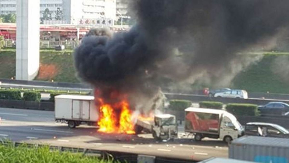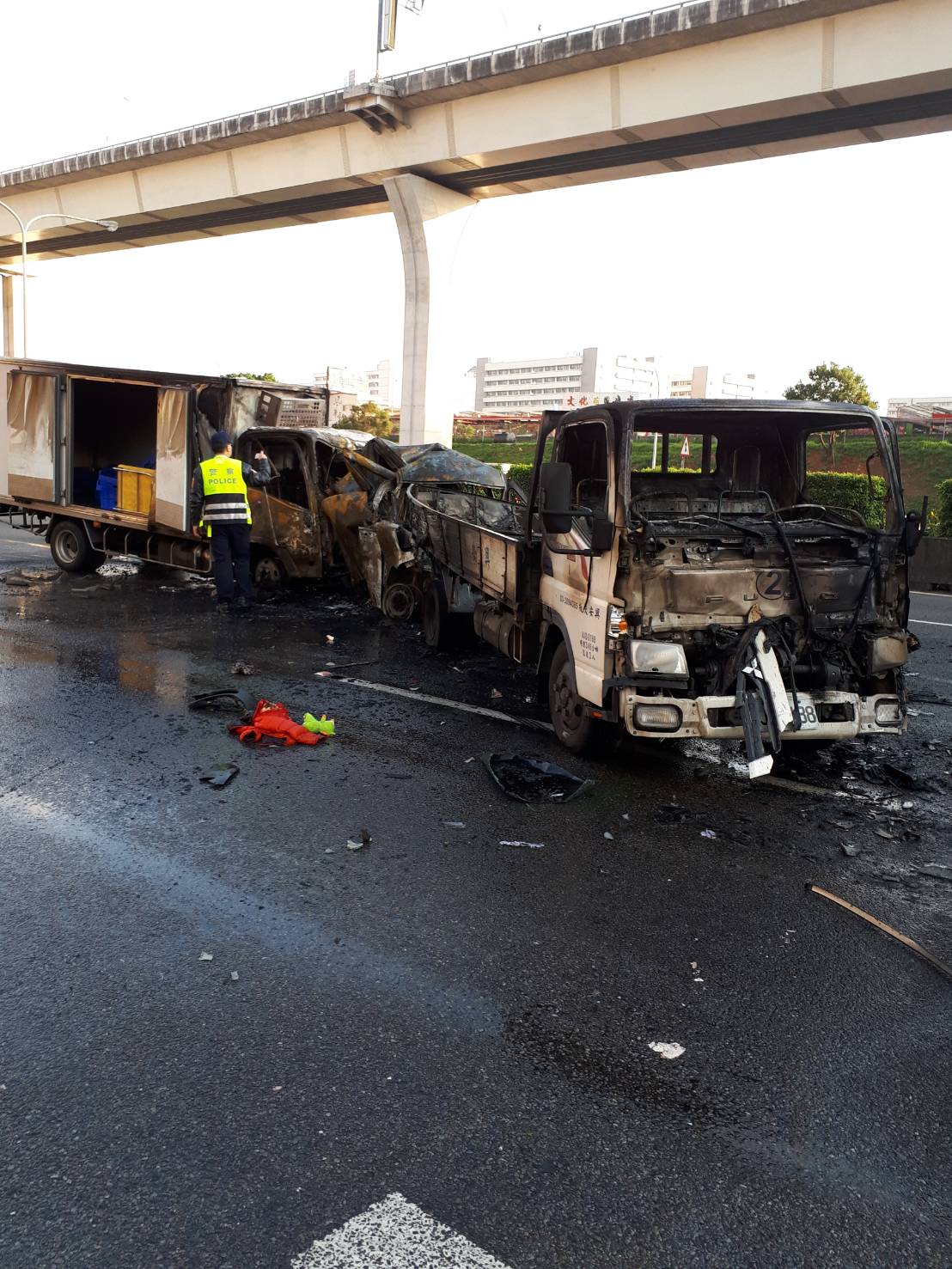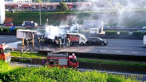 國道一號林口路段南下41.3k處,日前下午3時許傳出,第4台貨車及2台小客車發生連環車禍,造成其中一部小貨車起火,新北市消防局獲報趕赴現場架設水線灌救,並派員逐車搜索,結果發現第6台貨車駕駛及第5車前座2人救出時已變成焦屍,無生命跡象,一名傷者送桃園林口長庚,目前火勢熄滅,警方正在釐清詳細事故原因。