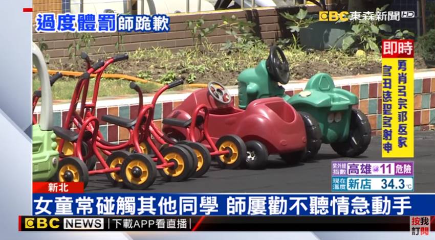 體罰過當。女童父母指控女兒的肚子被槌打了將近20下,在這過程造成肚子淤青,甚至孩子還被要求在午休時間,抱著棉被罰站2小時。事情發生在這個月10號,當天是慶祝母親節活動,正在玩遊戲的小女童活潑好動,在廁所附近拍打其他同學身體,造成其他幼童困擾。