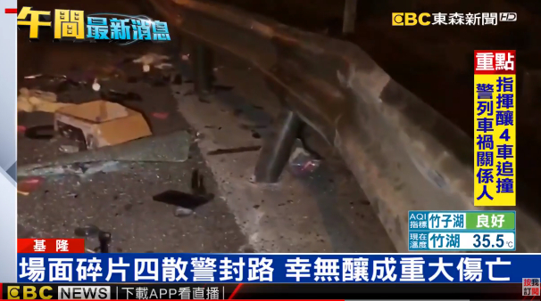 現場地面留下長長煞車痕跡,中央護欄也因為強烈衝擊被撞的歪七扭八,強大的撞擊力 讓車內物品散落各地,警方也暫時封閉道路、清掃路面,撿起四散的物品,以免阻礙其他用路人,強烈重擊導致駕駛傷及腦部,送醫後昏迷指數3,經過搶救後,生命跡象恢復,醫院抽血檢驗,換算後酒測值高達0.9毫克。