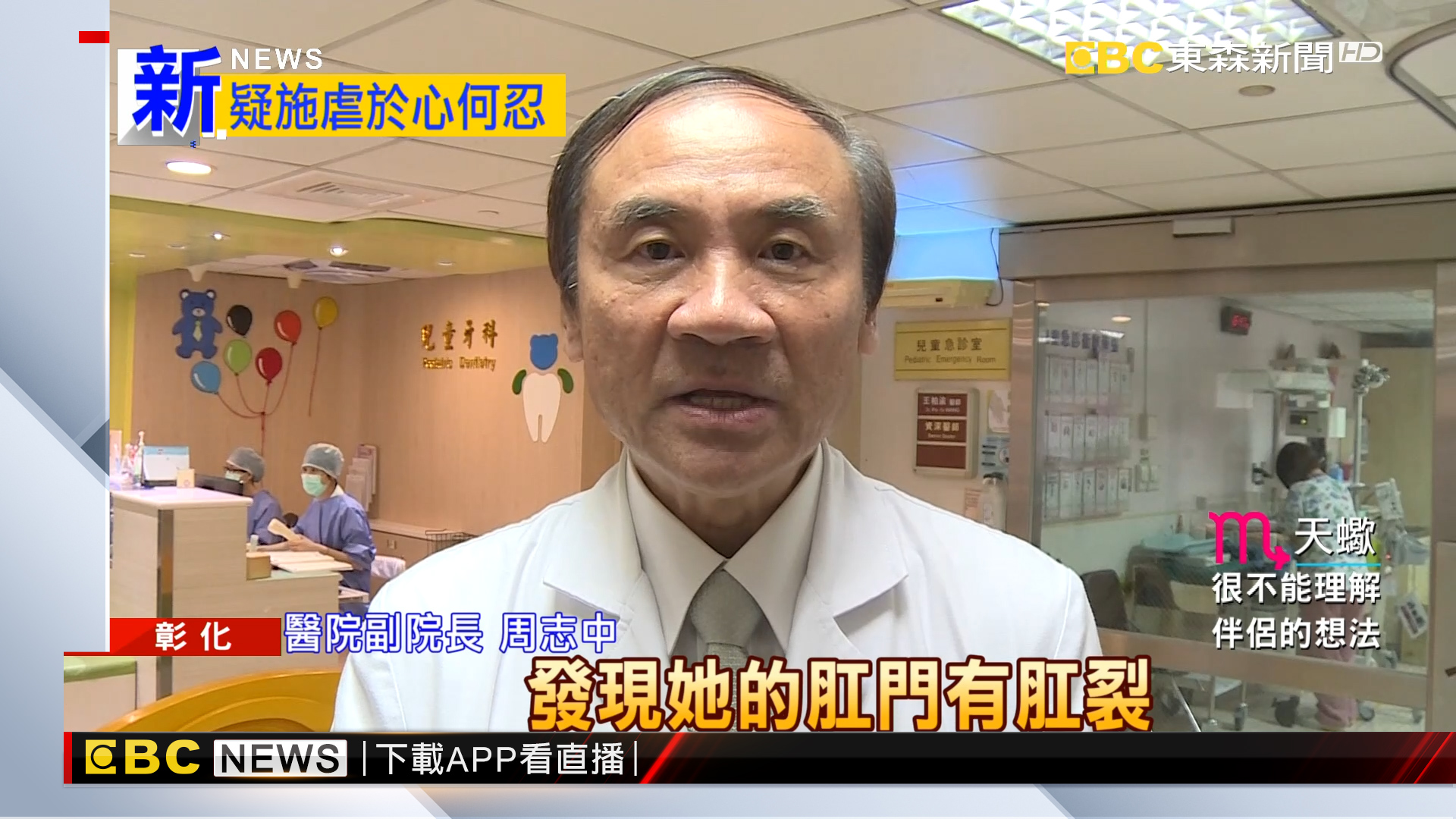 醫院副院長周志中表示,小妹妹昏迷指數只有3到4分,全身幫她檢查,前胸、後背、四肢全部都新傷跟舊傷,瘀青血腫,然後有一些破皮傷,看起來非常可憐,發現她的肛門有肛裂,肛裂的話對小女孩來講可能有異物進入。