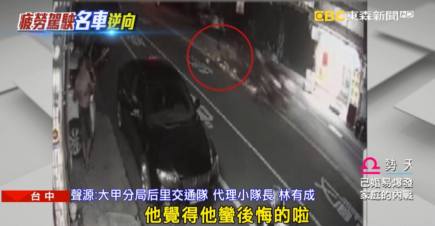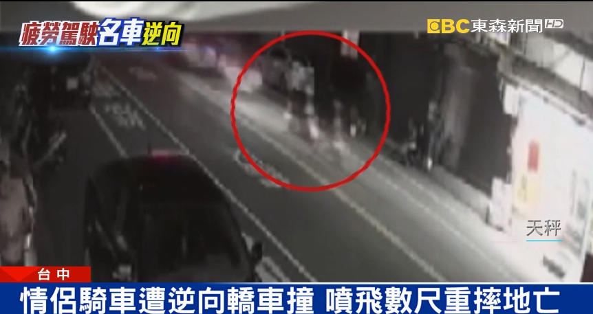 事發在15號凌晨12點,一對情侶騎車行經台中外埔甲后路上,卻被一輛轎車逆向撞上,警方表示肇事駕駛供稱是疲勞開車才釀禍。大甲分局后里交通隊代理小隊長林有成:「當時是疲勞駕駛跨越過雙黃線,撞到有一部重機車騎士,他覺得他蠻後悔的啦,因為他是疲勞駕駛。」