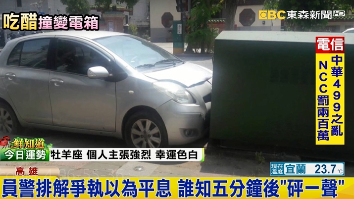 自撞電箱的車禍,但其實車禍的背後,是一名婦人打翻醋罈子,想不開的後果。主角是這名婦人,派出所前有幾好名員警陪同走上救護車,幸好婦人撞車後沒有受傷,不過他的車頭凹了進去還得要人推。在他自撞
