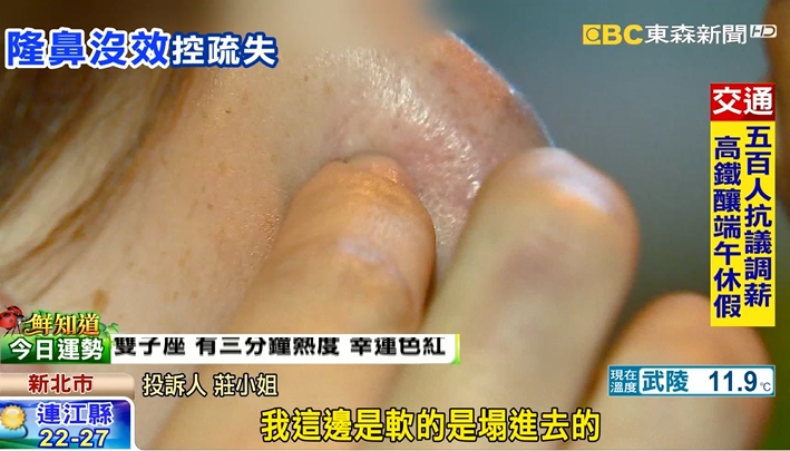 投訴人莊小姐:「我這邊是軟的是塌進去的,然後有一條線,好像有一個斷骨斷掉的那種感覺。」手術後,鼻子開始紅腫發癢,三個月鼻子裡的填充物竟然從鼻尖穿出,讓她嚇壞了。