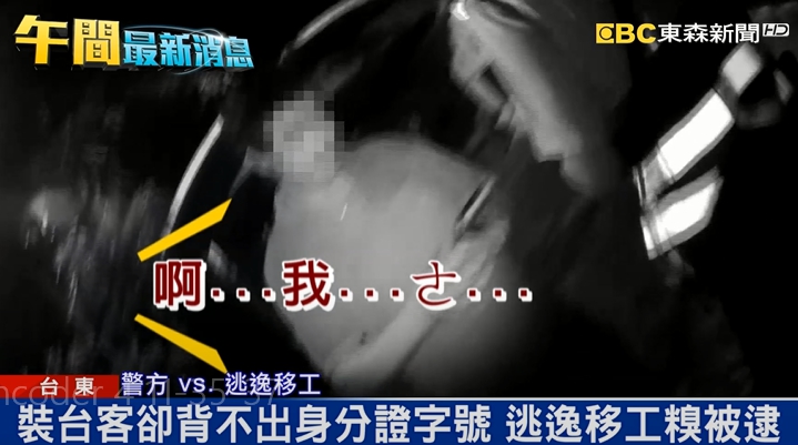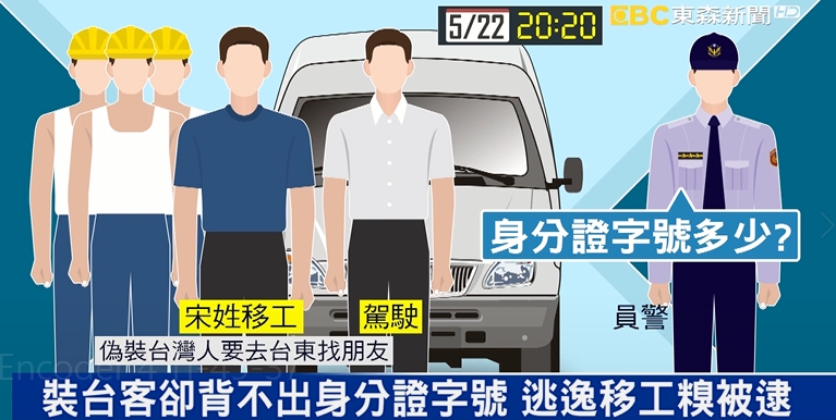 逃逸移工,男子講了一口流利台語假裝是台灣人,說要到屏東找朋友,但外表實在不像台灣人,警方進一步追問:「你的身分證號碼第一個英文字母是什麼?」男子當場呆住,答不出來立刻被抓。