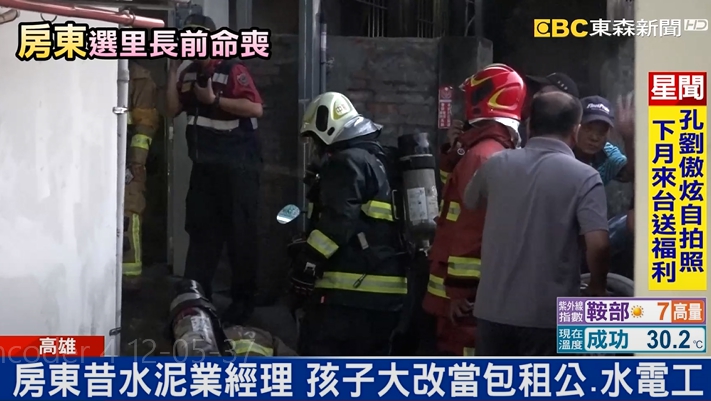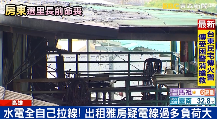 死者陳姓房東的太太,一整個早上忙上忙下,半夜三點才知道發生火警,回到家中先生已經全身焦黑。她說先生過去在對岸當經理,把兩個孩子拉拔長大,一個留美、一個留日,才辭去工作,開始當起包租公的生活,還打算選參選里長。當包租公外,房東還是水電工,這棟磚造鐵皮屋,裡頭的水電都是陳姓房東自己接的,還在每個角落都裝上監視器,監視器的電線也是房東自己拉線。