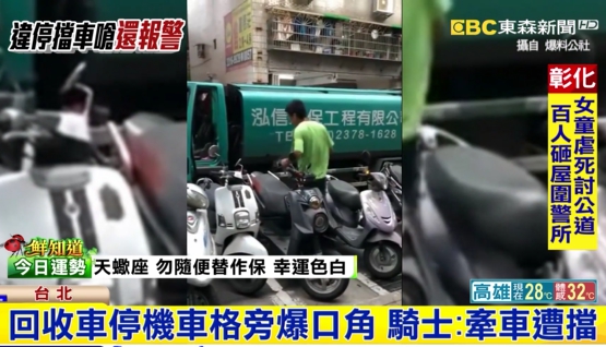 被擋車的騎士,氣不過現身說法。被擋車騎士:「他(回收車駕駛)完全不怕說,我檢舉他還是報警什麼之類的,甚至就嗆我說,你拍啊!你告啊!那我就真的拍了,警察就一直說那不然把影片刪掉,他再移車。」