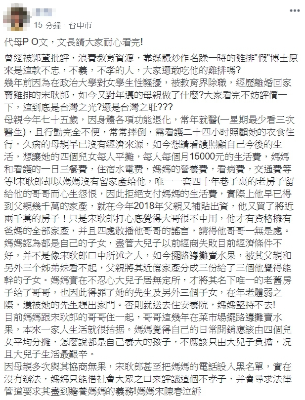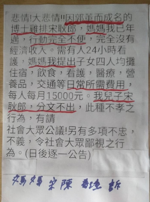 《爆料公社》自稱代婆婆PO文,宋耿郎75歲的母親因年紀已大,身體各項功能退化,一周最少要看3次醫生,而且行動不便,經常摔倒受傷,需要看護24小時在旁照料,但宋母早已沒有經濟來源,因此希望4個子女平均分攤自己的生活開銷,1人每月支付1萬5000元生活費。