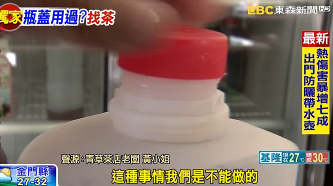 第一次打開瓶蓋絕對有聲音,但是店裏同時零賣杯裝的,還有青草和苦茶調和的茶,就會打開全新的來調,店員錯拿用來零賣的那一瓶。青草茶店老闆黃小姐:「我之前做環保有折五塊錢,但顧客要拿他們自己用過的那一瓶來回裝,而不是說從我們店內拿新的瓶子給他,他回收瓶子再來裝青草茶,我們再賣給客人這種事情我們是不能做的。」
