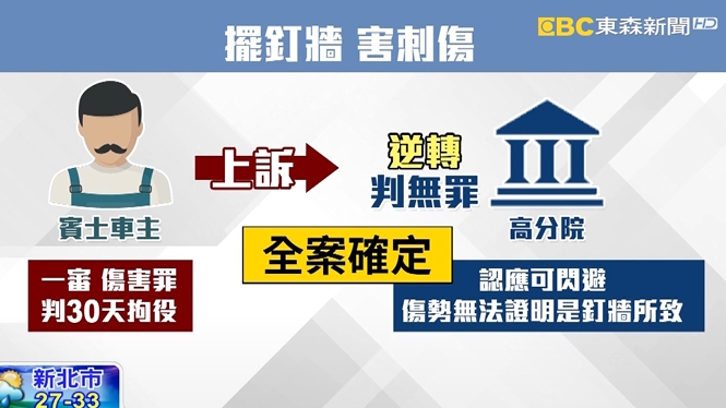 劉先生說自己的腿還被刺傷,憤而向法院提告,一審法院依照傷害罪,判擺釘牆的隔壁車位,賓士車主30天拘役,上訴後高等法院認為,應可閃避,而且劉姓車主的傷勢,無法證明是釘牆所致,逆轉改判無罪全案確定。