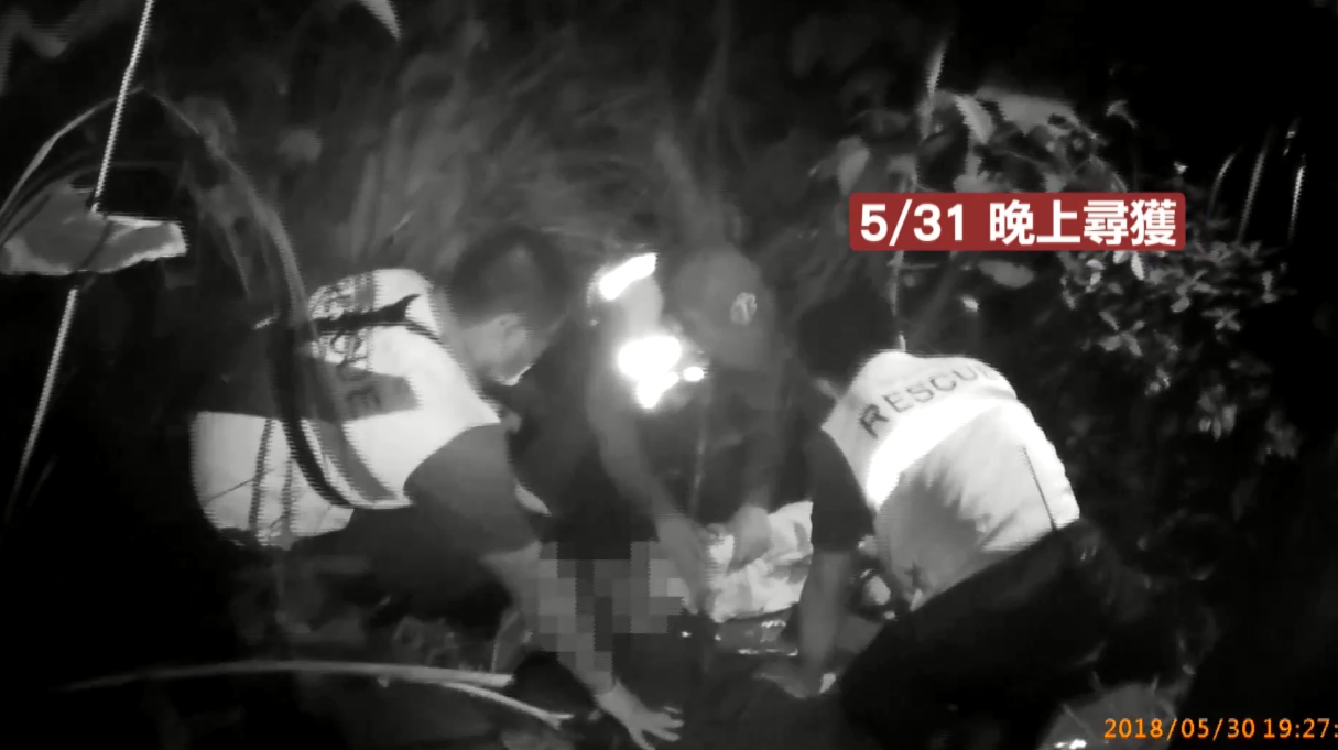 40多名警消摸黑搜索失蹤3天的鄭姓老翁,警消邊呼喊邊翻開路邊草叢,不放過任何蛛絲馬跡。有警消聽到步道涼亭下方傳來微弱回應聲,大批人馬趕緊上前搜索,終於找到虛弱倒地的老翁,3、4名警消小心翼翼的將他扶起,慢慢將救護墊滑進老翁身體下方,抬出緊急送醫。
