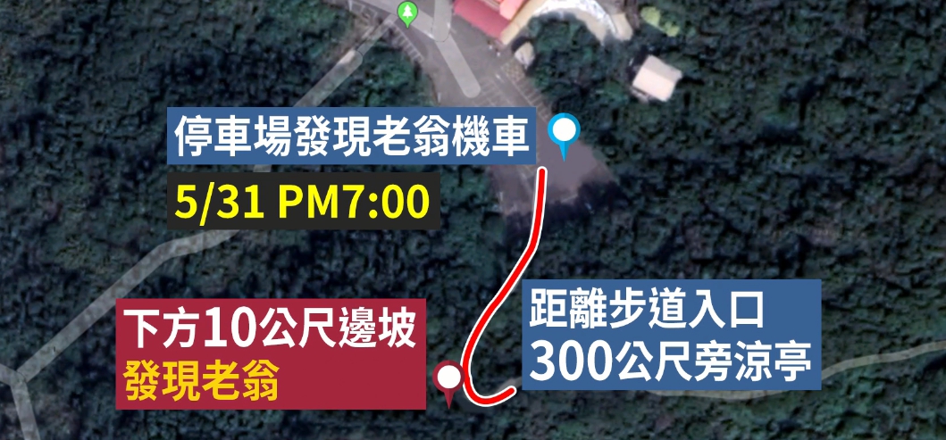 72歲的鄭姓老翁5月27號到竹北鳳崎步道運動,沒想到卻從此失聯了整整三天,老翁家人心急如焚報警,警方先在旁邊的停車場發現老翁機車,出動大批警力搜索卻都一無所獲。直到5月31號晚上7點多,才在距離步道入口300公尺處下方約10公尺的邊坡,發現全身多處擦傷奄奄一息的老翁。跟著員警重回現場,老翁當時騎的機車還留在停車場,距離老翁被發現的涼亭後方邊坡,從入口走過來只要10分鐘左右時間,為什麼老翁卻受困了三天三夜。
