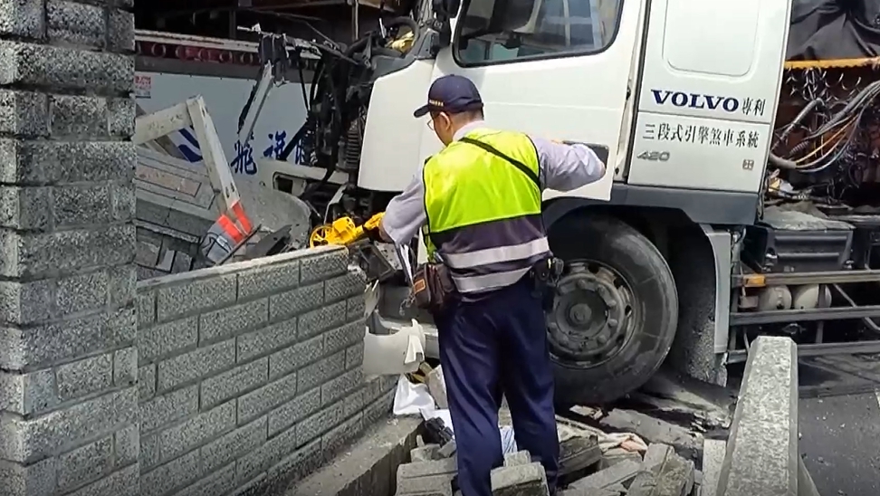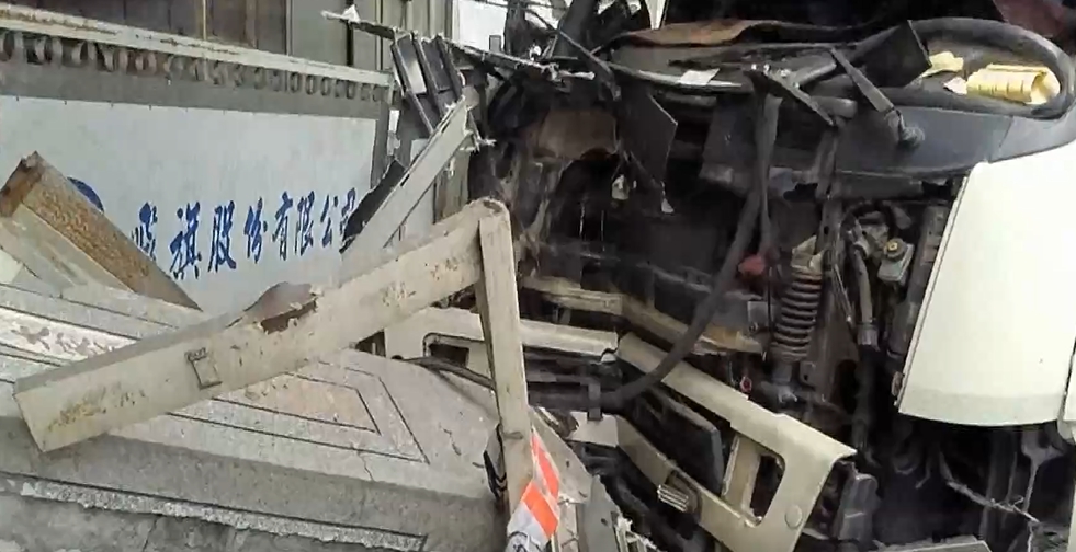 砂石車車頭撇了45度撞進工廠,路邊水泥護欄還有大門整座石柱,全都被撞倒,車頭也被撞到凹進去,昨(1)日中午12點多一聲巨響,嚇壞工廠員工。