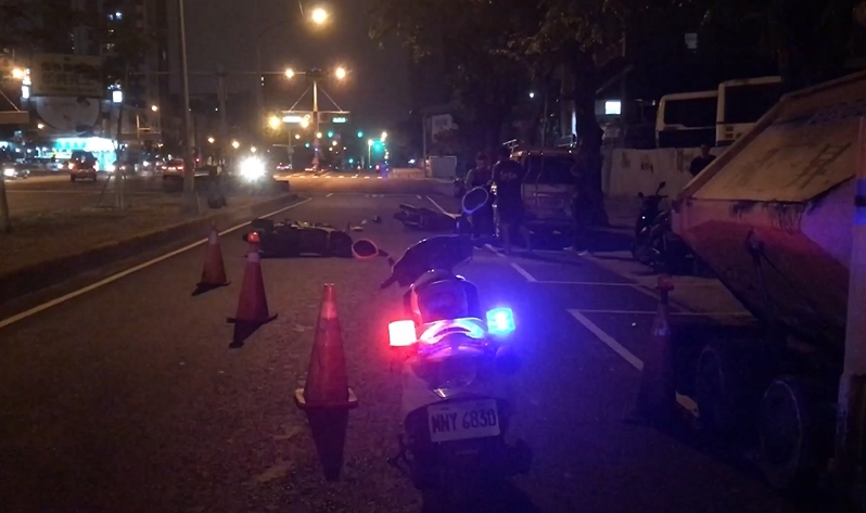 當時,員警在場攔停第一輛機車後,後面三輛機車,疑似未保持安全距離,煞車不及,全部撞在一塊兒。這一撞,也讓最後一部的機車騎士遭撞飛。該路段就在電子商場和學校附近,常常有車禍事故,連附近店家有時都會幫忙處理。