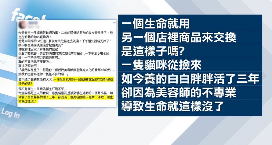 有網友27號在臉書社團幫朋友PO文,表示貓咪上午送去寵物店洗澡,下午就接到電話表是貓咪死了,但更令飼主火大的是,寵物店事後表示,願意負擔火化費,並用另一隻貓賠償。網友氣歪表示,「一個生命就用另一個店裡商品來交換,是這樣子嗎?」