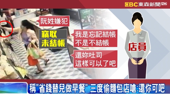 2號下午四點多,這名家住新北市三峽的阮姓婦人,跟朋友相約永和用餐,準備回家時,進到連鎖麵包店內偷吐司,嫌犯跟警察說,她的行竊動機全為了省錢替兒子做早餐。永和分局中正橋所長陳文品:「執行搜身,因為她是竊盜現行犯,發現她身上其實有千元大鈔,並不是說身上沒有錢付帳。」