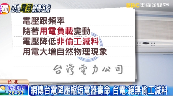 台電說明,電力系統的電壓跟頻率本來就會隨著「用電負載」而變動,電壓降低並不是偷工減料,而是用電大量增加的自然物理現象,家用電器包括冷氣、電腦、馬達、變壓器等,設計時已經將電壓變動納入考量,不會影響用戶的電器設備安全,夏天到供電吃緊,台電又常常傳出跳電問題,如果情況沒改善,恐怕民眾會繼續擔心供電品質。