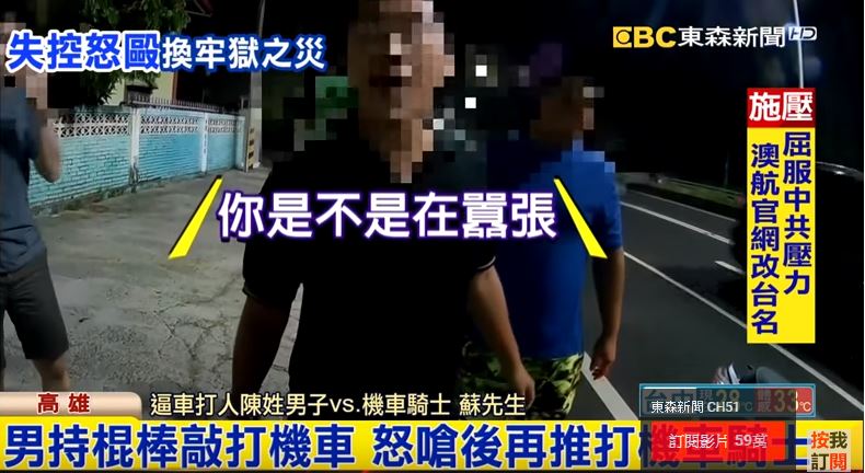 機車騎士蘇姓男子騎車騎到一半,突然被陳姓男子和他的友人攔下來,陳姓男子不斷叫囂嗆聲,還打開車門,拿出棍棒打人。