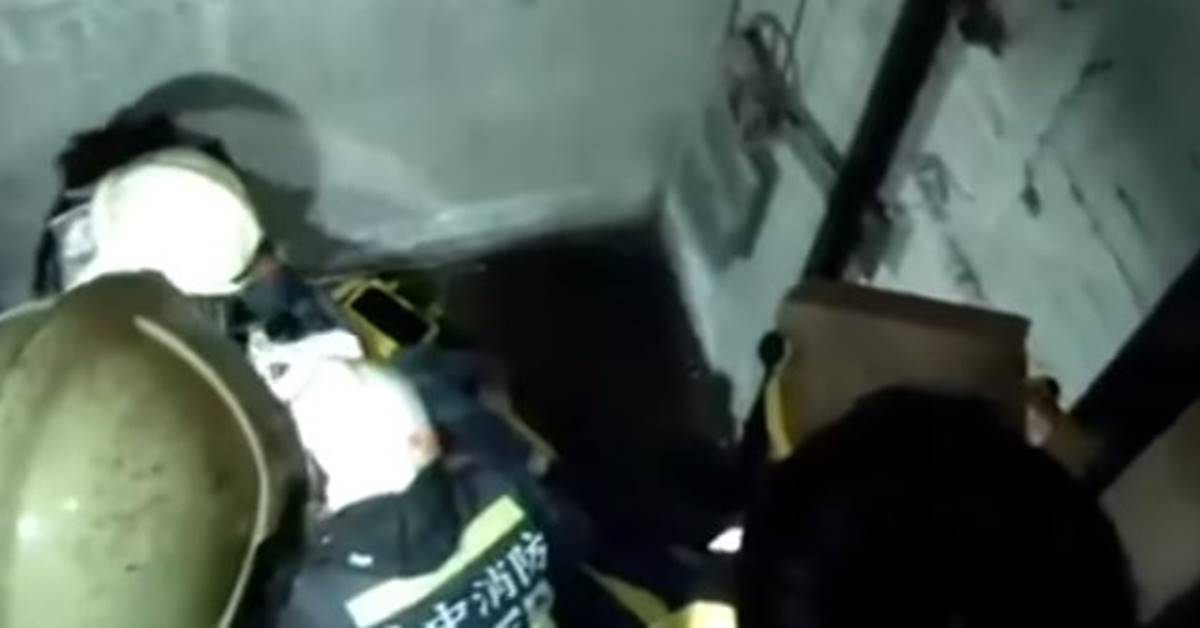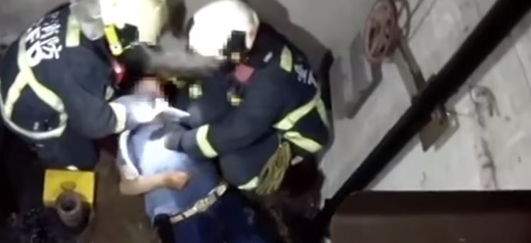 消防人員在電梯門口,設法將受傷男子救出來,男子的頭部還流著血,兩名消防員利用長背板先將他固定,好不容易才將男子從電梯井裡救出來。
