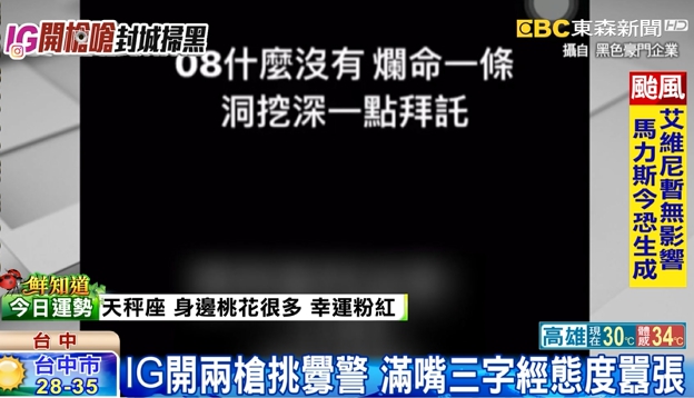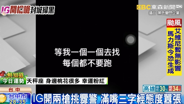 他不但在社群軟體開限時直播,語氣極盡兇狠。發佈限時動態時,正巧是台中市警方執行大規模封城掃黑行動的時刻,雖然在影片中無法以環境或是ID看出地點跟男子的身分,但警方對這段影片相當重視已經著手追查男子發文,社群軟體的ID身分,進一步追出男子身分,以及釐清使用槍枝是否涉及其他刑案。