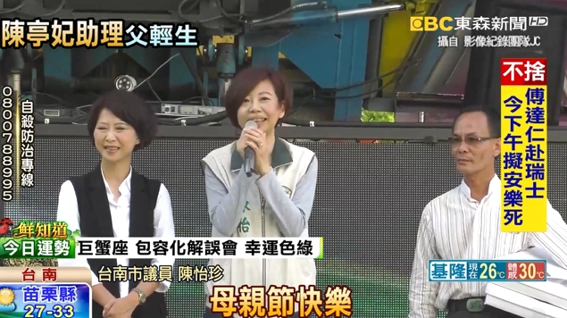 5月母親節活動,陳亭妃和妹妹陳怡珍同台。台南市議員陳怡珍:「主要是要祝福每一個偉大的媽媽,母親節快樂。」站在陳亭妃旁邊的是妹妹陳怡珍,也是台南市議員,姊妹倆常一起跑行程,先後致詞,感情好外界都知道,而父親自焚的黃姓助理,常陪同兩人出席活動,上個月在姊妹倆發康乃馨給民眾的同時,身穿白上衣的黃姓助理,還特別手機拍照紀錄。