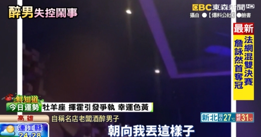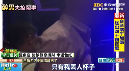 自稱名店老闆酒醉男子:「高雄市你知道沒人敢丟我杯子,只有我丟人杯子,只有我丟人杯子而已!」嗆聲的酒醉男子,自稱是高雄知名早餐名店老闆,6號晚間11點多,目擊民眾說男子疑似在這間餐酒館騷擾外籍客人,不滿被勸導摔酒杯嗆,遭到對方也回摔杯子,他才這麼火大,對此餐酒館業者不願回應,而男子自稱是這間早餐店的老闆,早餐店也還沒營業無法證實,到底真相是什麼?只有當事人最清楚。