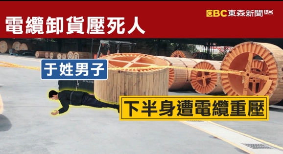 堆高機把電纜從車上卸下,但不知道為何,大型捲筒電纜滑動,從車上滾下,站在旁邊的于姓工人就被壓住,當場死亡。